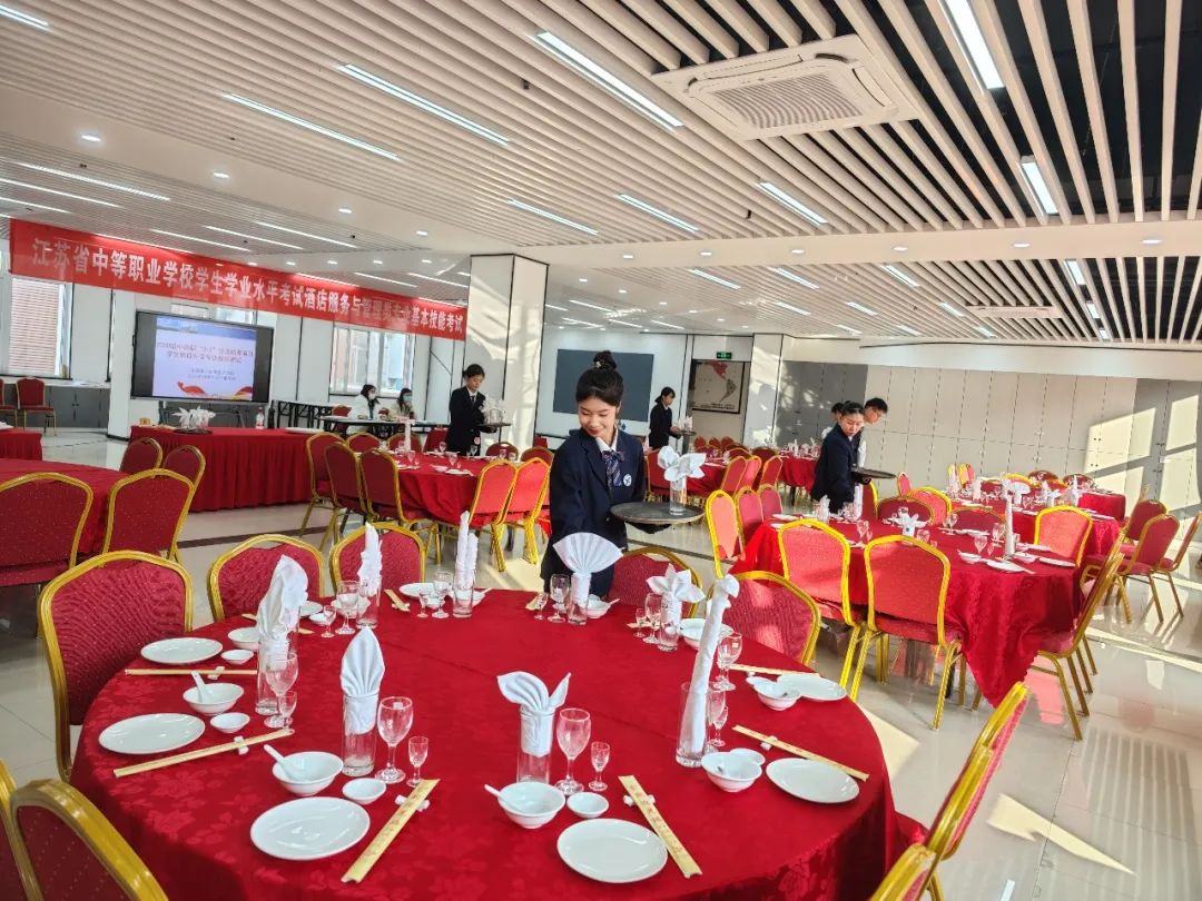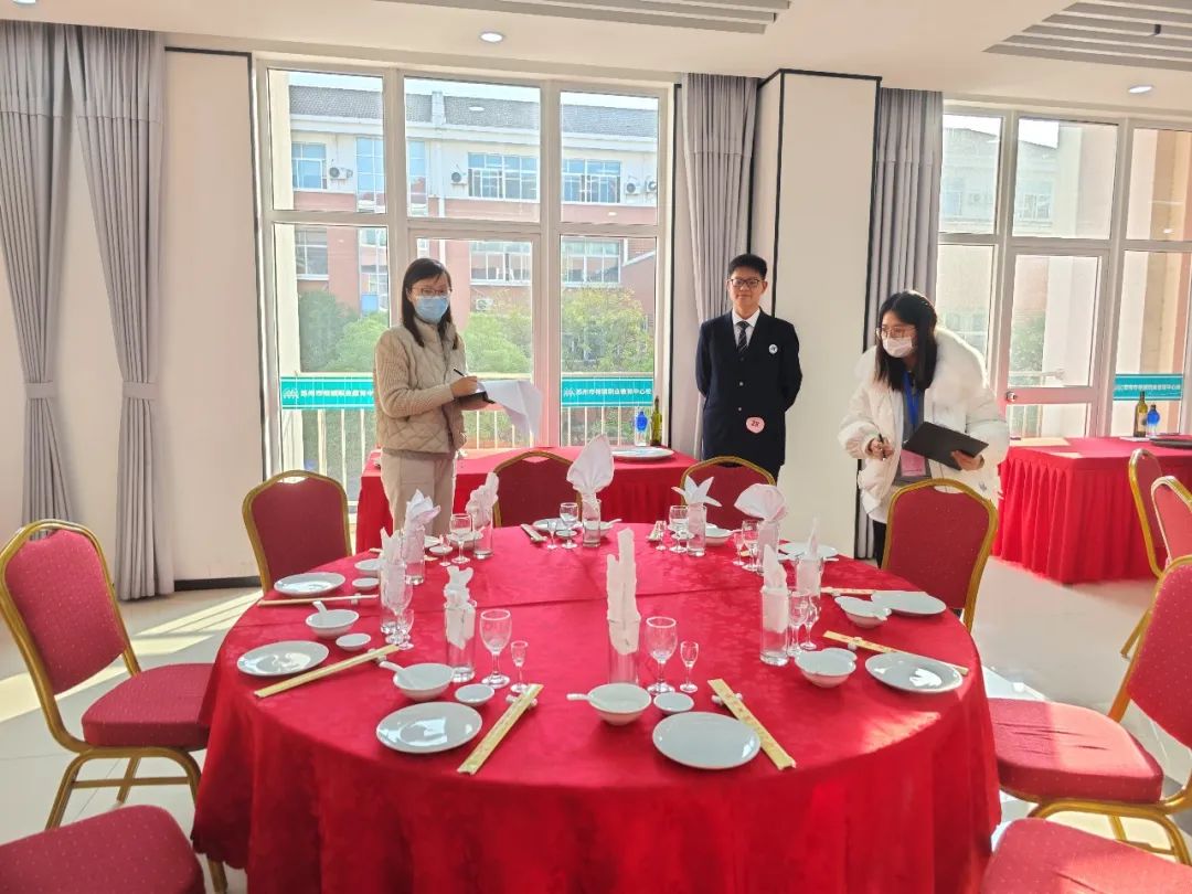 上午基础理论考试在悦心楼北四楼阶梯教室举行,用时两小时,包括《前厅》、《客房》、《餐饮》三门酒店专业核心课程理论知识。下午,基本技能考试在悦心楼南二楼的餐饮服务实训室进行,分形象展示和中餐宴会摆台两个环节。无锡商业职业技术学院徐老师和金老师对每一位考生的仪容仪表和台面进行了认真考评打分。